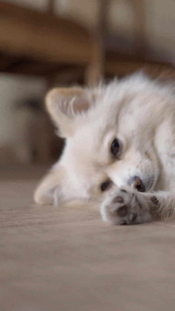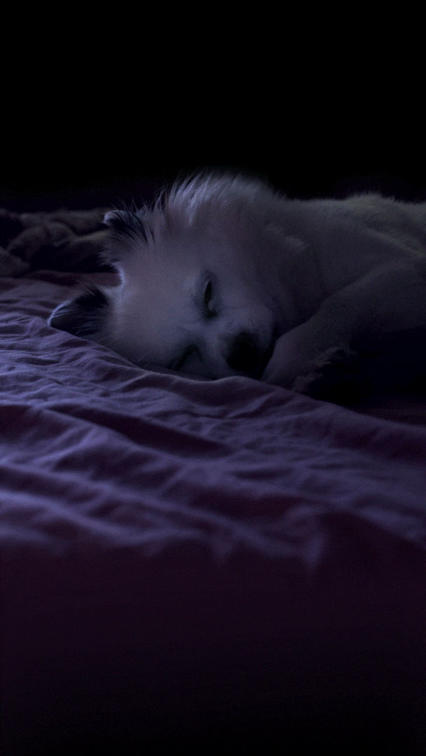 Fun fact: the stock video of the black labrador did not originally have its leg moving to scratch itself, and the stock video of the White Spitz licking its paw in bed at night was originally a daytime shot.
